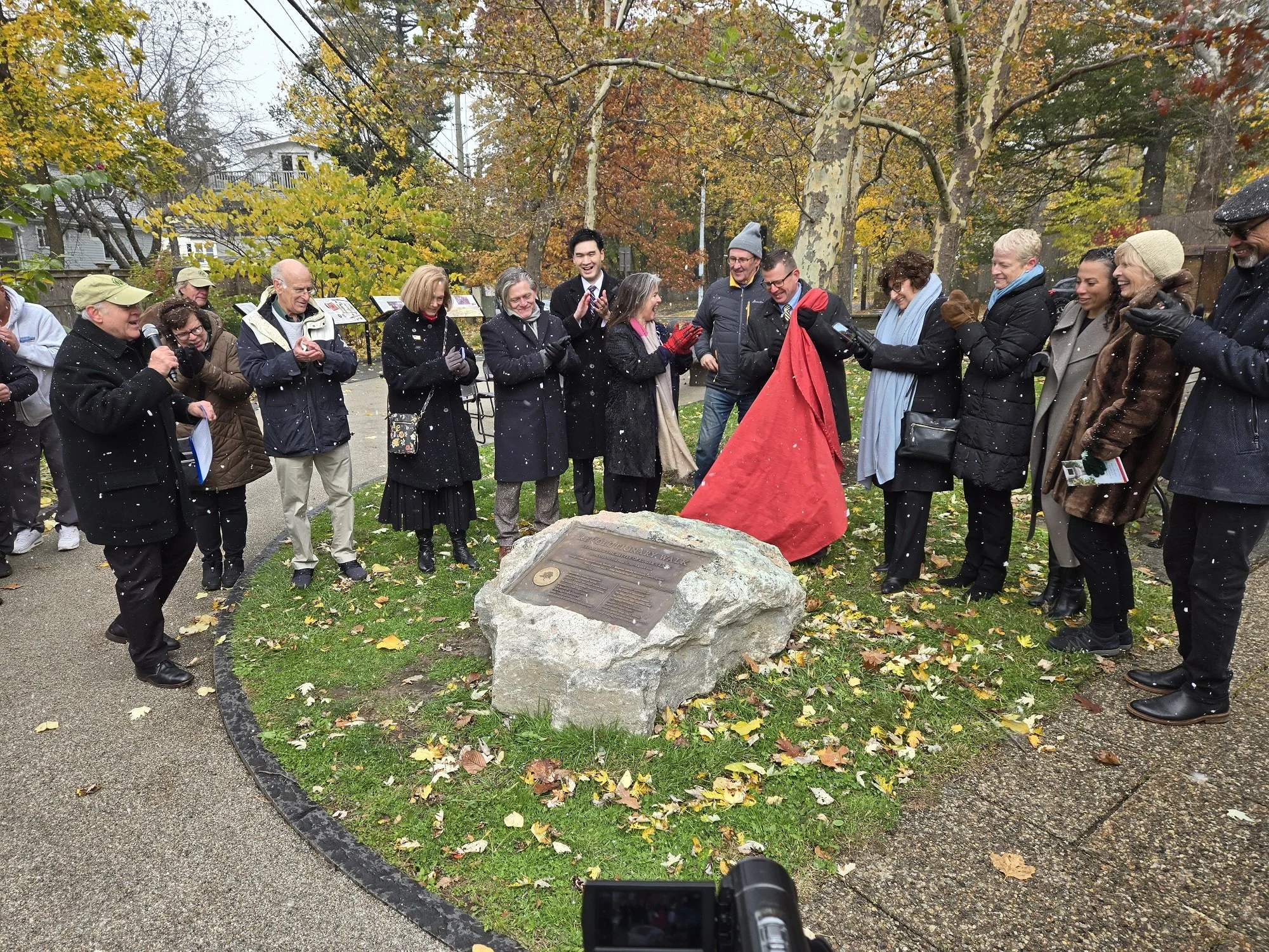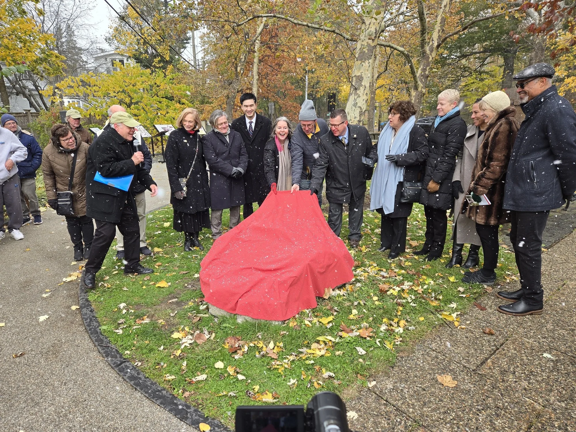 As part of snowy Veterans Day observances, Revolutionary Hastings at last unveiled the marker commemorating those who worked so hard to create Revolutionary Walk and the beautiful garden that cradles it. Special thanks were extended to the colleagues and family of Benny Bulfamante, our beloved construction and landscaping genius who passed away far too young this past summer. In attendance were his brother Stephen and close colleague Anthony, as well as State Representative MaryJane Shimsky, Mayor Armacost, Mayer-Elect Drake, former Mayor Swiderski, Hastings-on-Hudson Trustees, Assistant Village Manager Costantini, village officials, neighbors and friends.