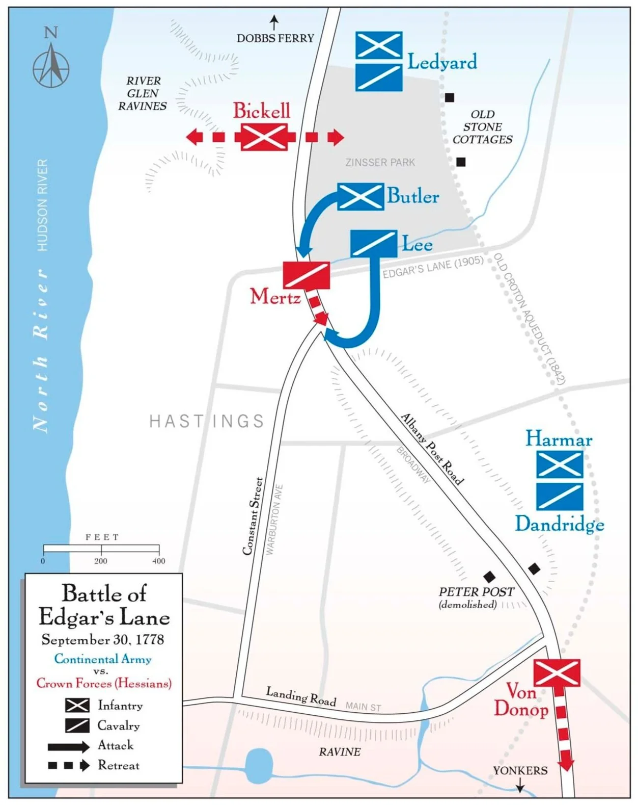 along the old Albany Post Road (today’s Broadway / Route 9) south of Dobbs Ferry (in today’s Hastings-on-Hudson) at Peter Post’s farm, a combined American force consisting of Continental infantry and cavalry, guided by local scout Isaac “Uck” Odell, ambushed a patrol of elite Hessian Jägers. Having received intelligence of Hessian patrols in the region, the Continental officer in charge deployed his soldiers in three groups along the east side of the Albany Post, with Major Henry Lee’s cavalry company in the center position. The cavalry of the approaching Hessian patrol advanced forward of the infantry, creating a gap in their lines, while one of the infantry units became bogged down crossing a large ravine. The center party of Continentals led by Major Lee sprang upon the Jäger cavalry company, while one Hessian infantry unit dispersed into the woods or towards the river, and the rearmost unit retreated backwards along the road.